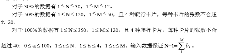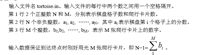 乌龟棋中 M 张爬行卡片,分成 4 种不同的类型(M 张卡片中不一定包含所有 4 种类型 的卡片,见样例),每种类型的卡片上分别标有 1、2、3、4 四个数字之一,表示使用这种卡 片后,乌龟棋子将向前爬行相应的格子数。游戏中,玩家每次需要从所有的爬行卡片中选择 一张之前没有使用过的爬行卡片,控制乌龟棋子前进相应的格子数,每张卡片只能使用一次。 游戏中,乌龟棋子自动获得起点格子的分数,并且在后续的爬行中每到达一个格子,就得到 该格子相应的分数。玩家终游戏得分就是乌龟棋子从起点到终点过程中到过的所有格子的 分数总和。 很明显,用不同的爬行卡片使用顺序会使得终游戏的得分不同,小明想要找到一种卡 片使用顺序使得终游戏得分多。 现在,告诉你棋盘上每个格子的分数和所有的爬行卡片,你能告诉小明,他多能得到 多少分吗?