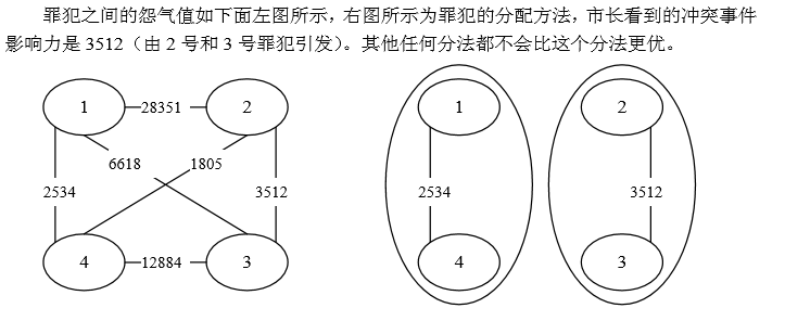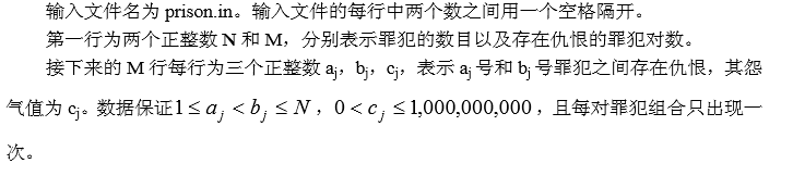 S 城现有两座监狱,一共关押着 N 名罪犯,编号分别为 1~N。他们之间的关系自然也极 不和谐。很多罪犯之间甚至积怨已久,如果客观条件具备则随时可能爆发冲突。我们用“怨 气值”(一个正整数值)来表示某两名罪犯之间的仇恨程度,怨气值越大,则这两名罪犯之 间的积怨越多。如果两名怨气值为 c 的罪犯被关押在同一监狱,他们俩之间会发生摩擦,并 造成影响力为 c 的冲突事件。 每年年末,警察局会将本年内监狱中的所有冲突事件按影响力从大到小排成一个列表, 然后上报到 S 城 Z 市长那里。公务繁忙的 Z 市长只会去看列表中的第一个事件的影响力, 如果影响很坏,他就会考虑撤换警察局长。 在详细考察了 N 名罪犯间的矛盾关系后,警察局长觉得压力巨大。他准备将罪犯们在 两座监狱内重新分配,以求产生的冲突事件影响力都较小,从而保住自己的乌纱帽。假设只 要处于同一监狱内的某两个罪犯间有仇恨,那么他们一定会在每年的某个时候发生摩擦。那 么,应如何分配罪犯,才能使 Z 市长看到的那个冲突事件的影响力小?这个小值是多少?
