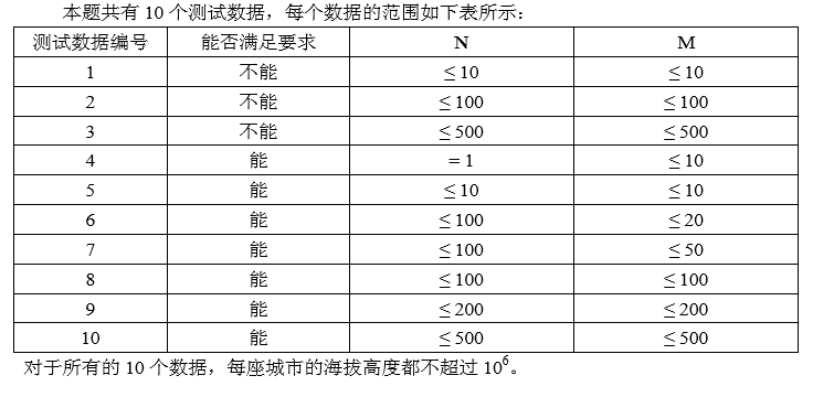 输入文件的每行中两个数之间用一个空格隔开。 输入的第一行是两个正整数 N 和 M,表示矩形的规模。 接下来 N 行,每行 M 个正整数,依次代表每座城市的海拔高度。